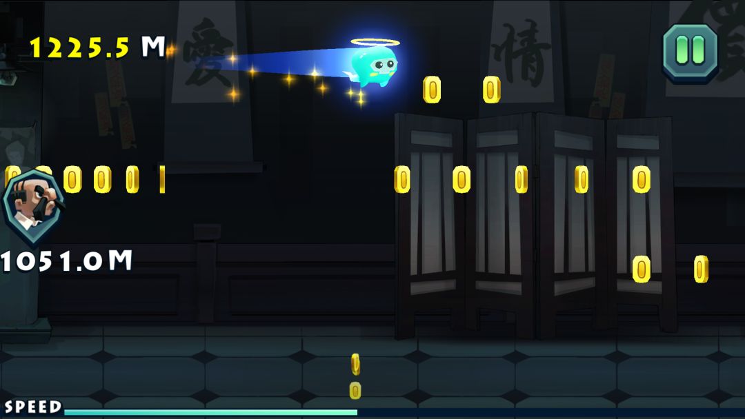 不知道怎么触发的 老黄貌似定住不动了 从200米左右开始就没有没出现过,而且和我的距离越来越远。最后哪怕我碰到弥勒佛被减速了距离也没再缩短,最后只能在3000米处送死让小狗吃了。吃了以后就卡屏了如下图。只能切换出去然后重新进游戏,刚刚打的3000米的记录也没有保存下来