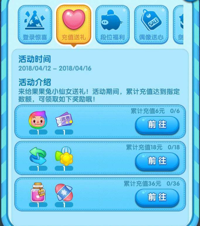 活动介绍:来给果果兔小仙女送礼!活动期间,累计充值达到指定数额,可领取翻倍奖励哦!