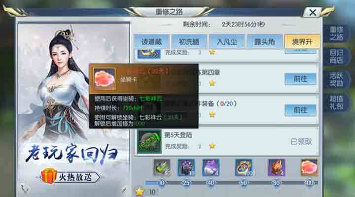 完成重修之路的任务可以获得金币,还有各种各样的道具,对回归玩家的修为肯定能有不小的提升,再加上其他的回归活动,相信回归玩家的修为肯定会提升的非常快,弥补退游那一段时间的损失。好了今天的回归之路境界升的介绍就到这里了,更多精彩内容请继续关注择天记手游。