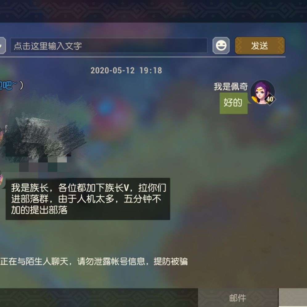 👇🏻图1:任务里面需要参加部落 随便点了进入 过了一分钟族长发私信给我 为了避免人机需要加他vx