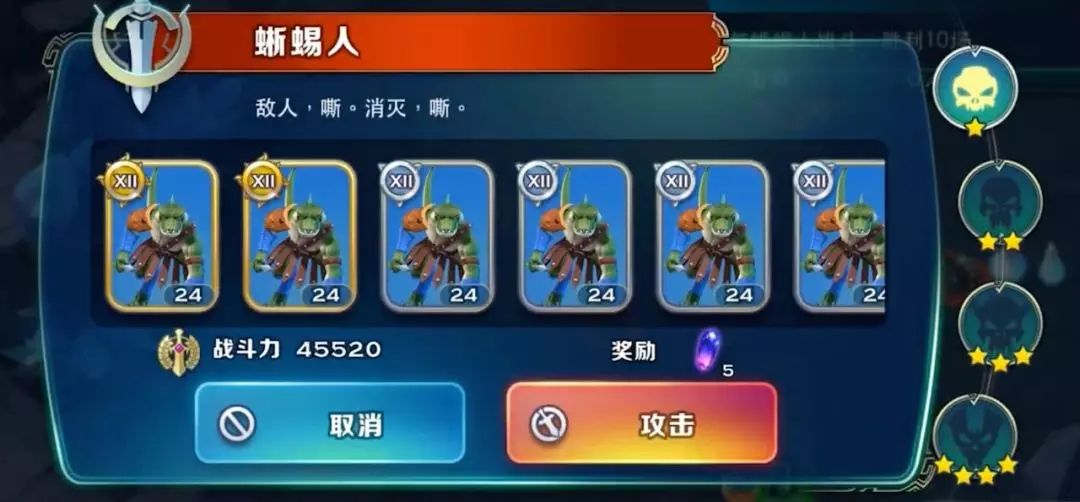 地上野怪的等级是与领主主城等级成正比的,所以基本上大家都是打下来没问题的。我们贴心地在右侧设置了野怪星级选项,打的星级越高,龙钢越多,如果战力不够,打一星级的也是可以的。很多领主都是阿瓦隆单英雄上阵,带三支队伍,省体力,收益高。