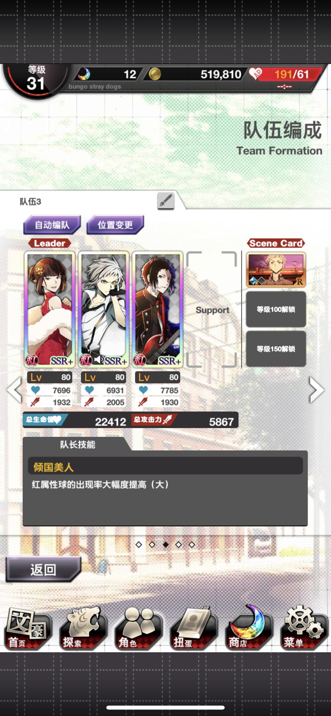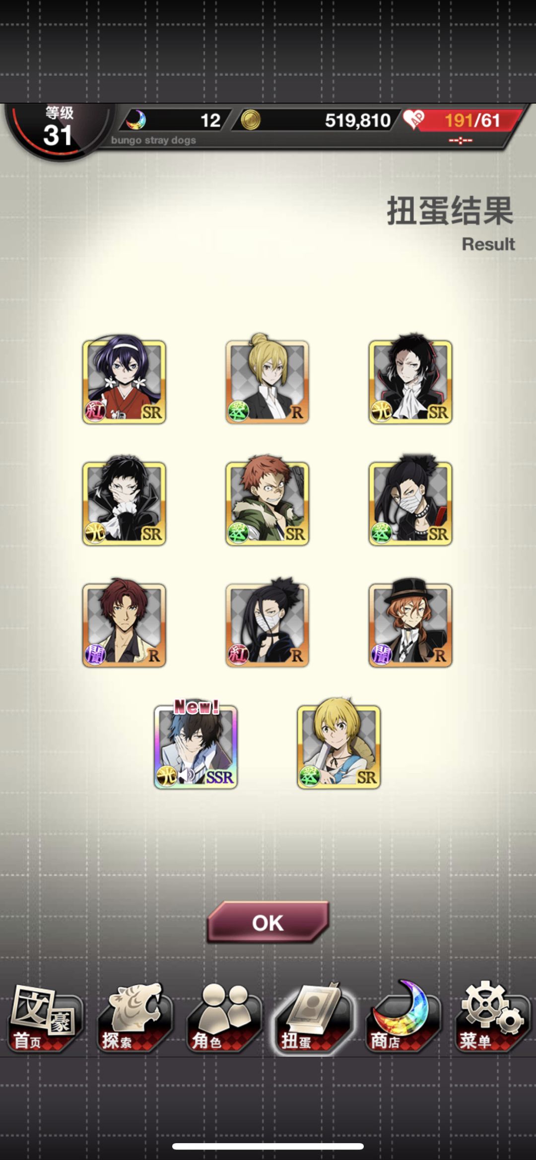一开始玩这游戏很非,和之前玩的抽卡游戏一样非,结果玩着玩着就发现这个游戏良心多了,今天第一发11连抽到了乐队芥川龙之介,第二发11连抽到了太宰治