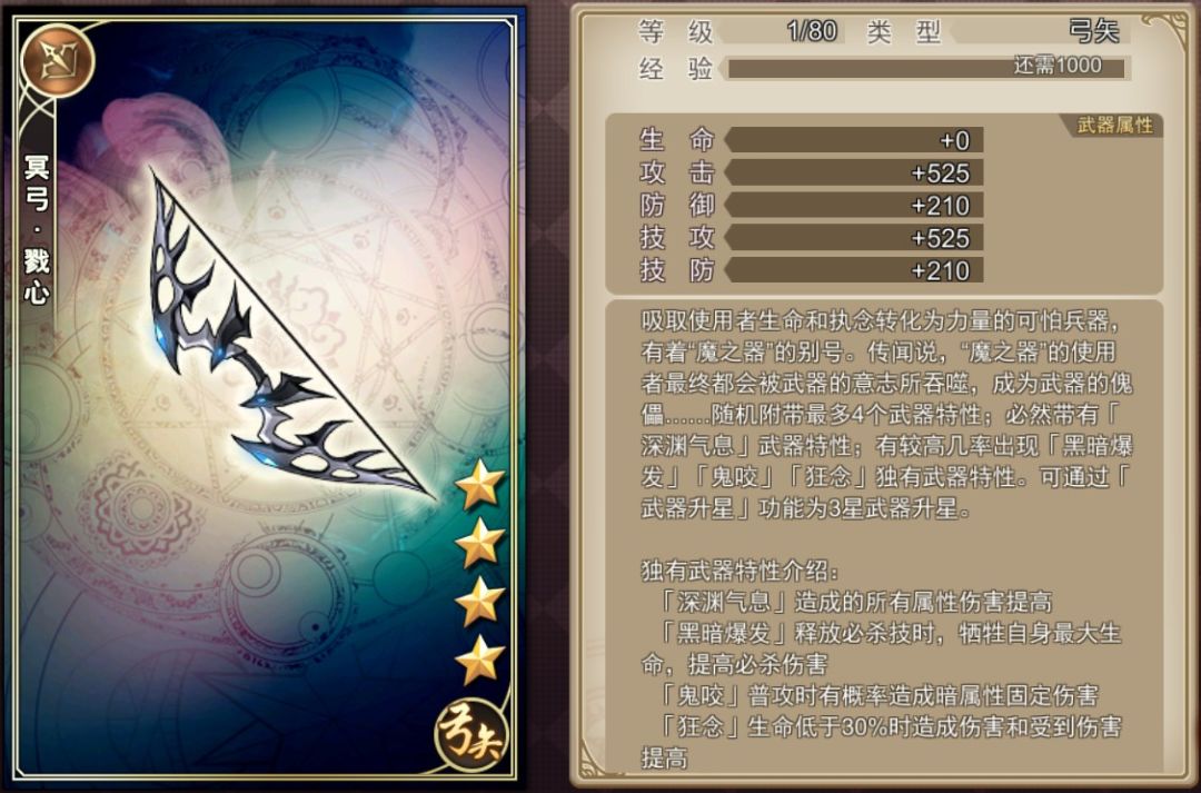 活动内容:全新《限时兵器会-冥弓·戮心》活动关卡开放。通过活动可获得4星弓箭武器——冥弓·戮心。