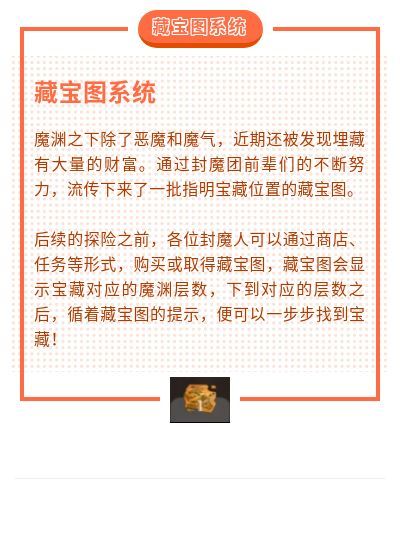根据阿紫的了解,此次发现的藏宝图数量非常巨大,封魔人营地决定将它妥善运用,服务于后续封魔人们的洞窟探险之中。大致的使用方法如下: