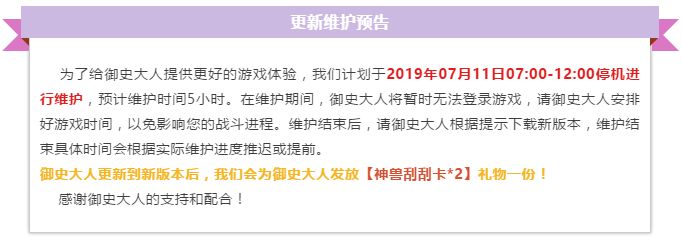 明天就是维护日啦,也请御史大人注意安排好时间哦~