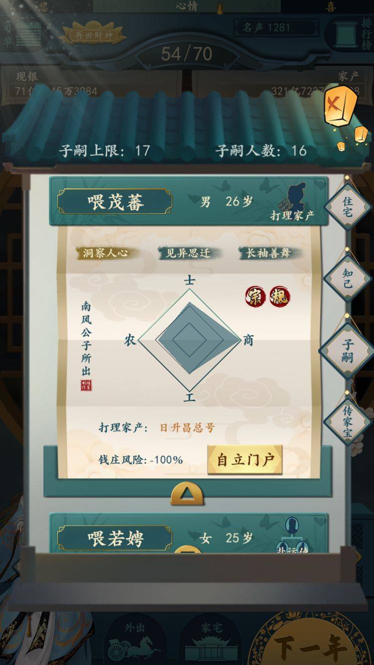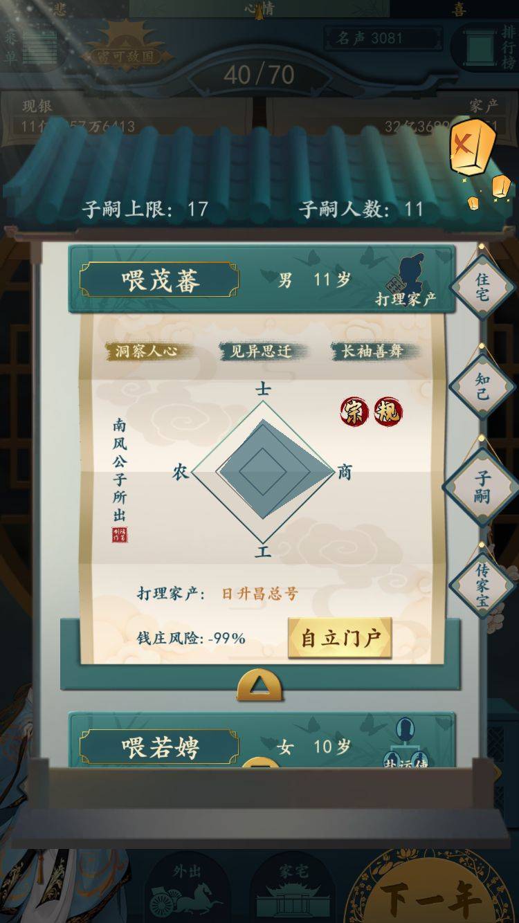 首先我们先了解一下尺子到底有什么作用。目前据官方所给的数据来看,尺子共有两个技能:1.增加4/6/8/10/12子嗣自立门户经验,那么问题来了:子嗣自立门户经验是什么,有什么用呢?╰( ̄▽ ̄)╭其实呢,子嗣成年时会蹦出两个选择:自立门户或者打理家产,那么谁会让一个三红的儿子去管东西呢,这时候你就会让他自立门户,其实自立门户时几年过后过后子嗣属性和自立门户获得的钱会缓慢提升,只是有点细微,细微到让人看不出来(o°ω°o),而这个加成虽然很小,但你三红的儿子也还在慢慢的往第二格努力啊┗( ▔, ▔ )┛,这样一来直接让你没机会改天赋的儿子属性和钱直接upupup啊!接下来就是重头戏了:尺子可以改变2/4/6/8/10子嗣天赋,这就比前面那个有些鸡肋的技能强很多了,一局内大家都遇到过这种情况,三红子嗣和先金紧接着俩红的子嗣,这种感觉很难受吧,有了这个传家宝都不用愁了,三红?滚开!先金?保底破二!这样不是非常快乐吗?给你们看几张成功的子嗣吧