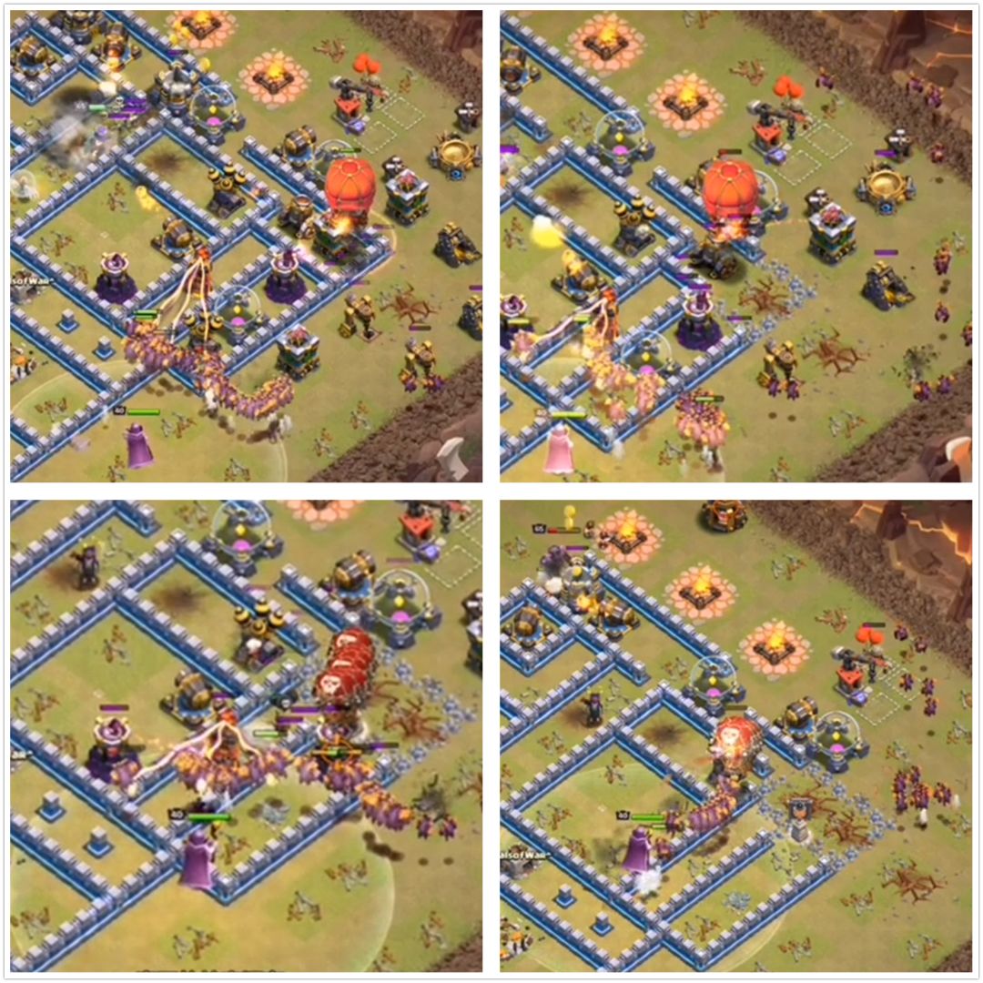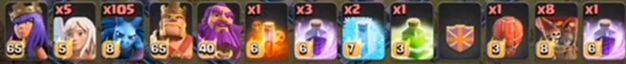 天女标配5天使,带4个狂暴法术是为了提升天使的奶量。2个冰冻法术需要看时机,一个给在女王这里,一个给在大本营这里,也许有的首领会问,为什么不多带狂暴法术而是带冰冻法术。由于这2个法术的性质是不一样的,一个是增加天使和女王的攻击,一个是暂时冻住敌方防御塔或女王的攻击。在某些时候,比如防御塔集中攻击女王的时候,此时冰冻法术要比狂暴法术更有用处。苍蝇这里带了105个,相当于除了5个天使,剩下全部带了苍蝇。因为本身天女已经消灭了一多半的建筑,剩下的用苍蝇清边,攻击其他的建筑都是绰绰有余的。当然,苍蝇还是比较怕法师塔的,那么此时我们怎么规避?攻城气球就派上用场了,另外还有咏王的大招支持。