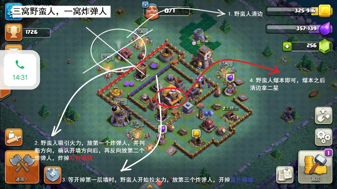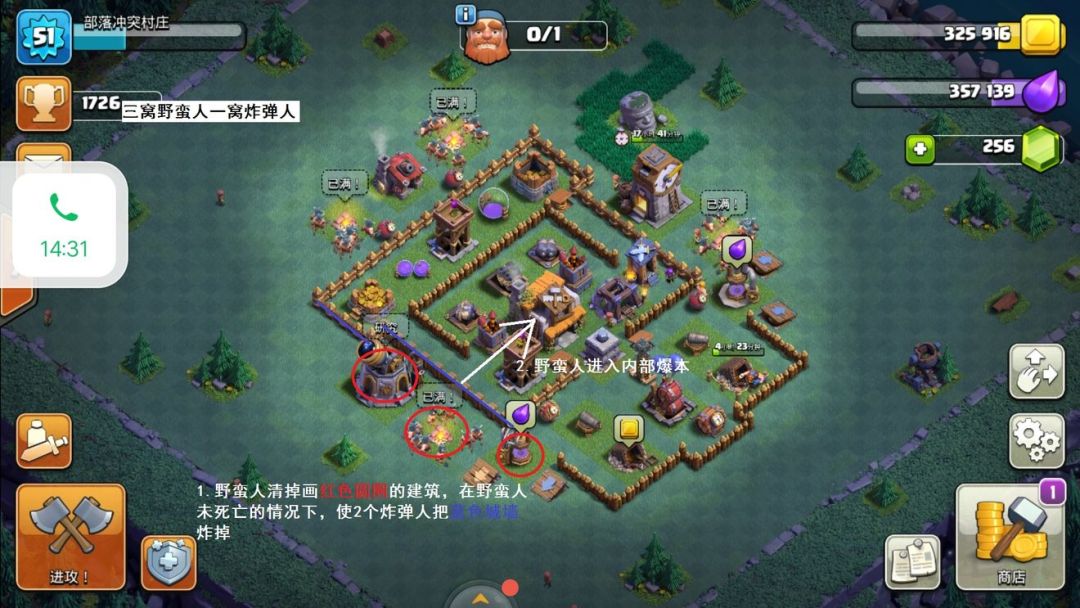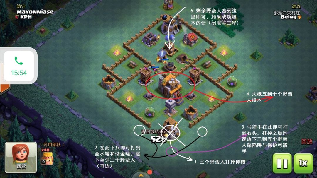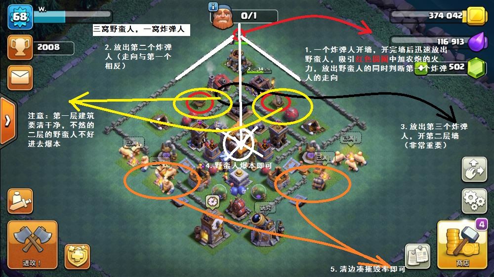 a.石头比较靠里,把兵营填满野蛮人即可,有人可能问了,你不说要防石头和巨型吗,是的我是说过,但是我没说要打掉石头啊,打不过可以绕嘛。打法如下: