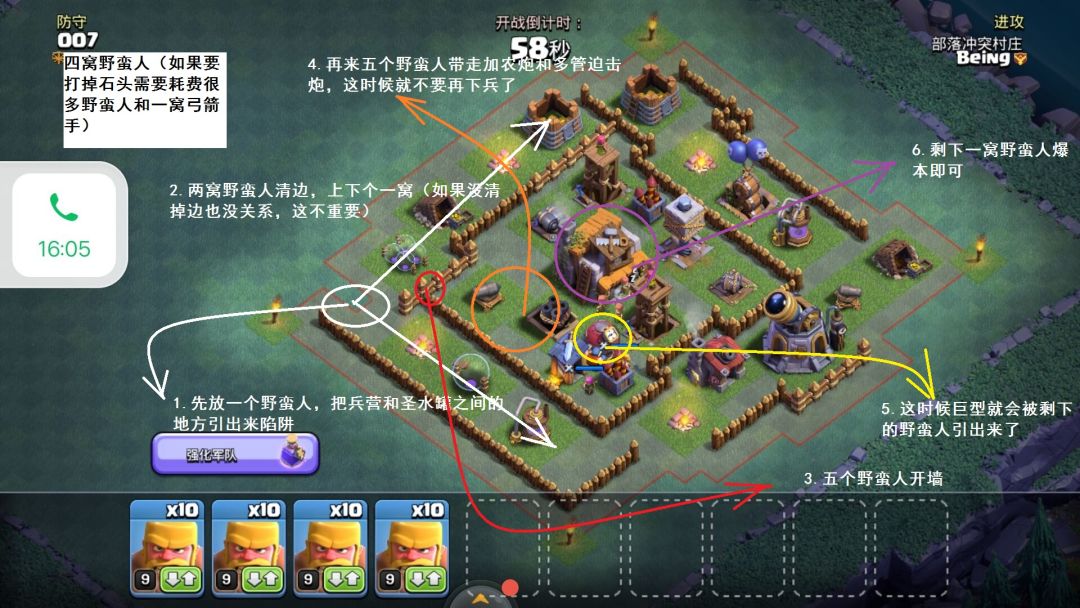 b.引导阵,配兵为三窝野蛮人一窝炸弹人,五本引导阵无非就是把你引到石头或巨型旁边,你所需要做的就是破坏他的阵型即可