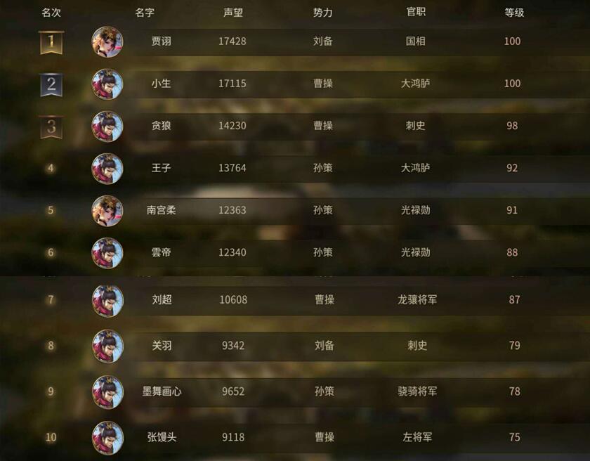 《墨三国》精英测试等级声望排行榜
