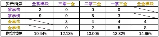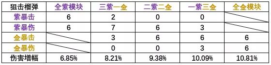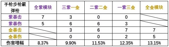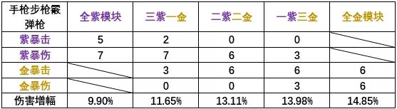 注意事项:手枪,自动步枪,霰弹枪的基础暴伤为150%;狙击枪与榴弹枪的基础暴伤为125%。因此每种情况分成两个表,但这仅仅是枪械的暴伤,所有角色技能的基础暴伤都为150%。(例如新年时无瑕依赖技能伤害,此时可以选择与手枪步枪霰弹枪角色一样的模块配置)