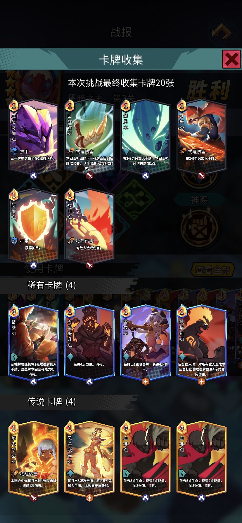 本来想出一个攻略的解说下每一个关卡怪兽和boss的打法的,可是太看脸了,有运气成分打第二层开始,我就不想一个一个解说打法了,分析一下拿手牌方向吧!开局起手拿满“剑舞”“烈风”再配“燎天斩空”基本都是稳定秒一个,需要两张“剑舞”“烈风”起码4星吧……