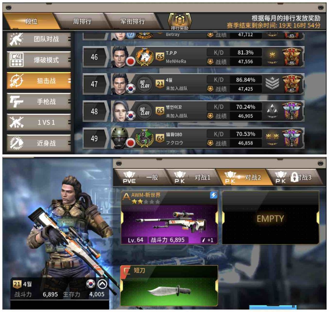 是的,你没有看错,21级的小号,在狙击战的传说段位。战斗力6895,生存力4005。