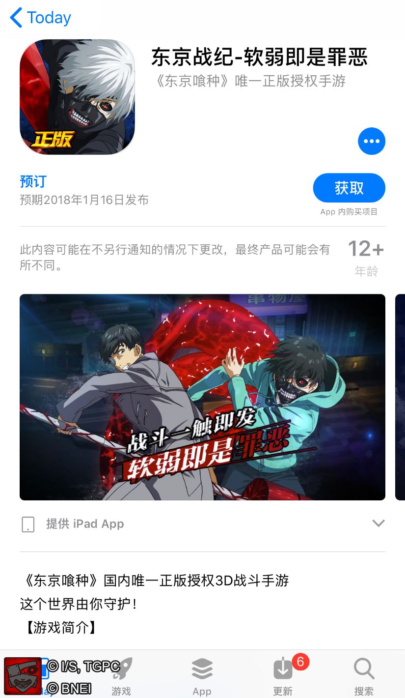 由万代南梦宫与数字天空共同研发的东京喰种正版3D战斗手游《东京战纪》即将在1月16日开启iOS公测,从今天开始,版本在iOS 11.2以上的玩家均可进入App Store,搜索“东京战纪”,点击预订按钮,游戏将在公测当日,在WIFI环境中自动下载。