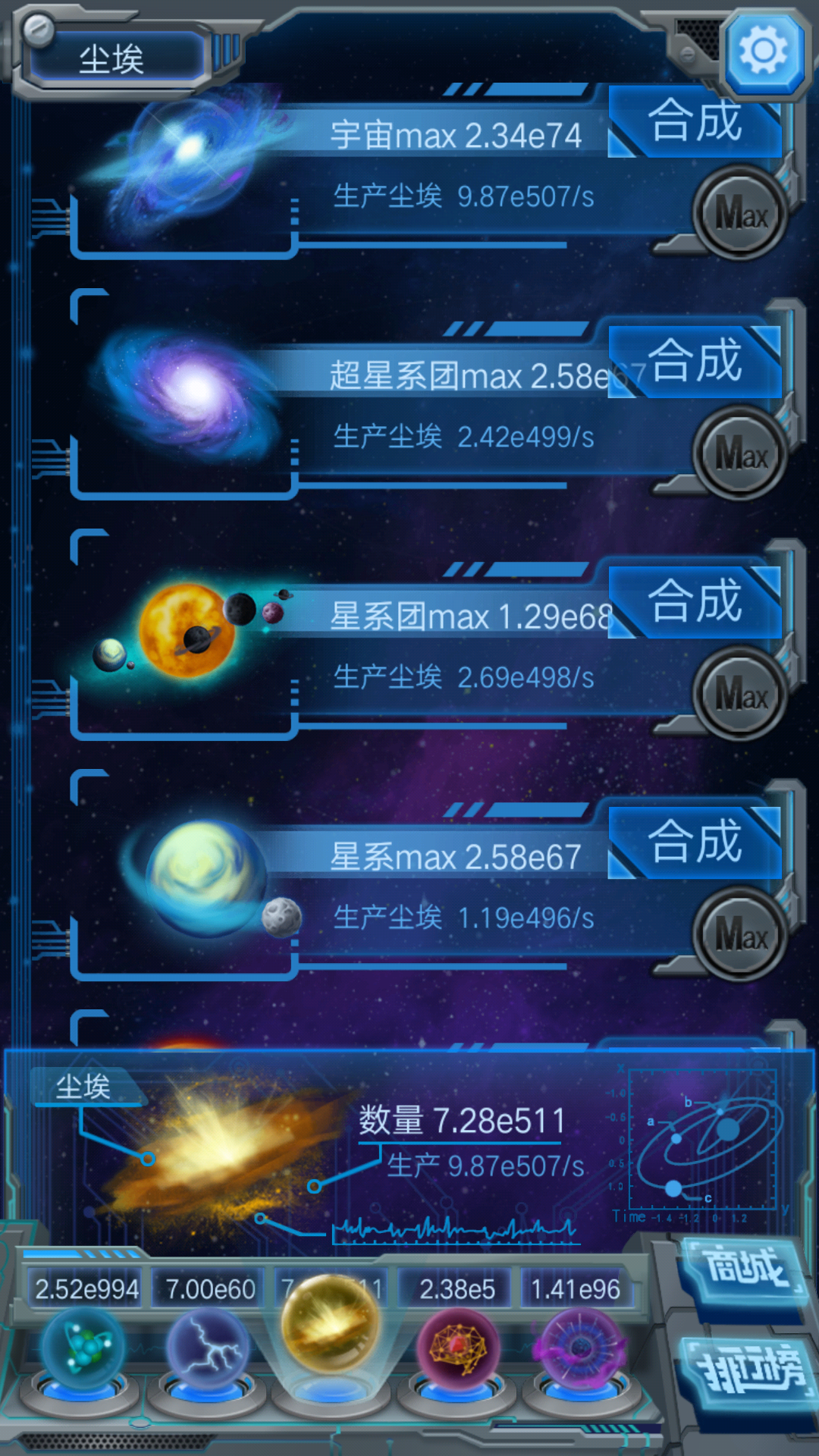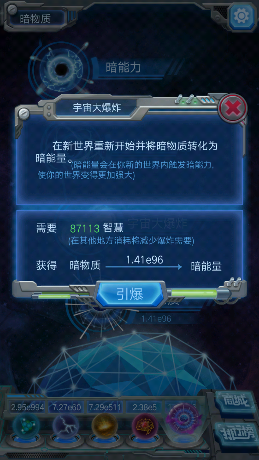 一炸以后退坑一段时间,一年后重新回归,点点点了一个星期卡在大鲵,然后两天半巨鳄两天甲龙一天霸王龙,再一天直接登顶母体(智慧长期一直攒的e5量级),扭曲流59分钟,当看到满屏幕物种升级的加号,混沌一下子要升50多级的时候,突然想到地球进化过程中恐龙时期的物种大爆炸,仿佛是巧合,也可能是游戏开发者有意为之。现在觉得暗物质足够多了,准备二炸了!
