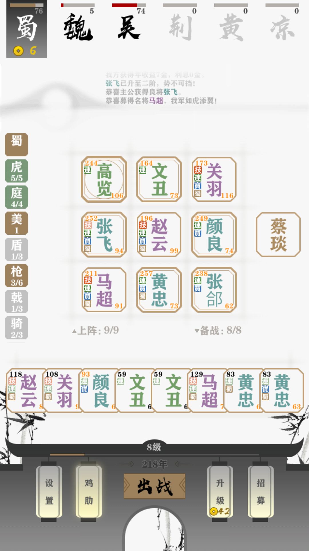 前期用3盾和3枪过度,中期留着3盾顶着压力凑齐四庭或者五虎,先出一个组合后满9人开始卖其他人,只要五虎和四庭。关于途中出现很多紫将5虎时要懂得取舍,不一定要追3阶紫将,可以追3阶绿将和蓝将一样起飞!76血通,其实平时运气好100血通也不是难事。