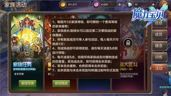 活动每位家族成员每天只能参加一次,而活动内容便是对一只魔物进行伤害,造成的伤害越高奖励就会越丰富,伤害并不是个人伤害,是整个家族的伤害哦!