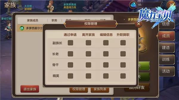 拥有管理权限的只有族长、副族长、长老,这三个职位能够同意申请的勇者们加入家族,也可以请离成员、编辑成员信息、升职降职哦!