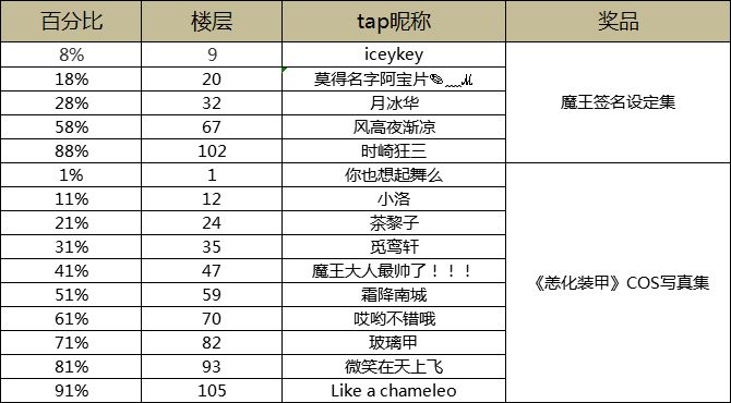 1. 活动结束后一周内,总楼层的8%、18%、28%、58%、88%将获得魔王签名版恙化装甲设定集2.0一本