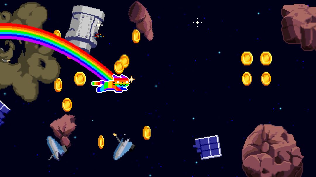 当然,作者在游戏中还是搞了很多有趣的地方,比如遇到狗,人,或者很多搞怪的物品,都会有特殊的效果,还是比较用心的,当然最让我喜欢的是,里面有个物品,吃了以后就可以用彩虹猫的形式,在金币的宇宙中穿梭,有点马里奥用树藤上天吃金币的味道。除此之外,还有一个个小段冲刺的道具,都让游戏有点炫酷的色彩。