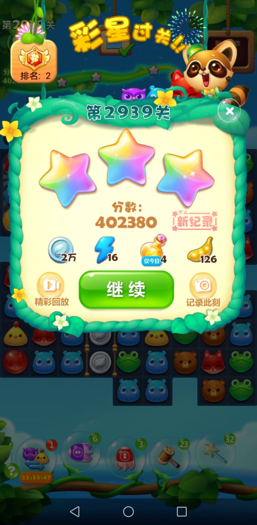 2939关,消除冰块,难点在右下角容易烂尾,开局打黄鸡,收集两波钥匙打开局面,尽快向下发展,建议多组四排特效,难度挺大,这是主线剩的最后一个豆荚关,三星和彩星分值差六万多,尽量节省步数以达到一次性彩星不打第二次
