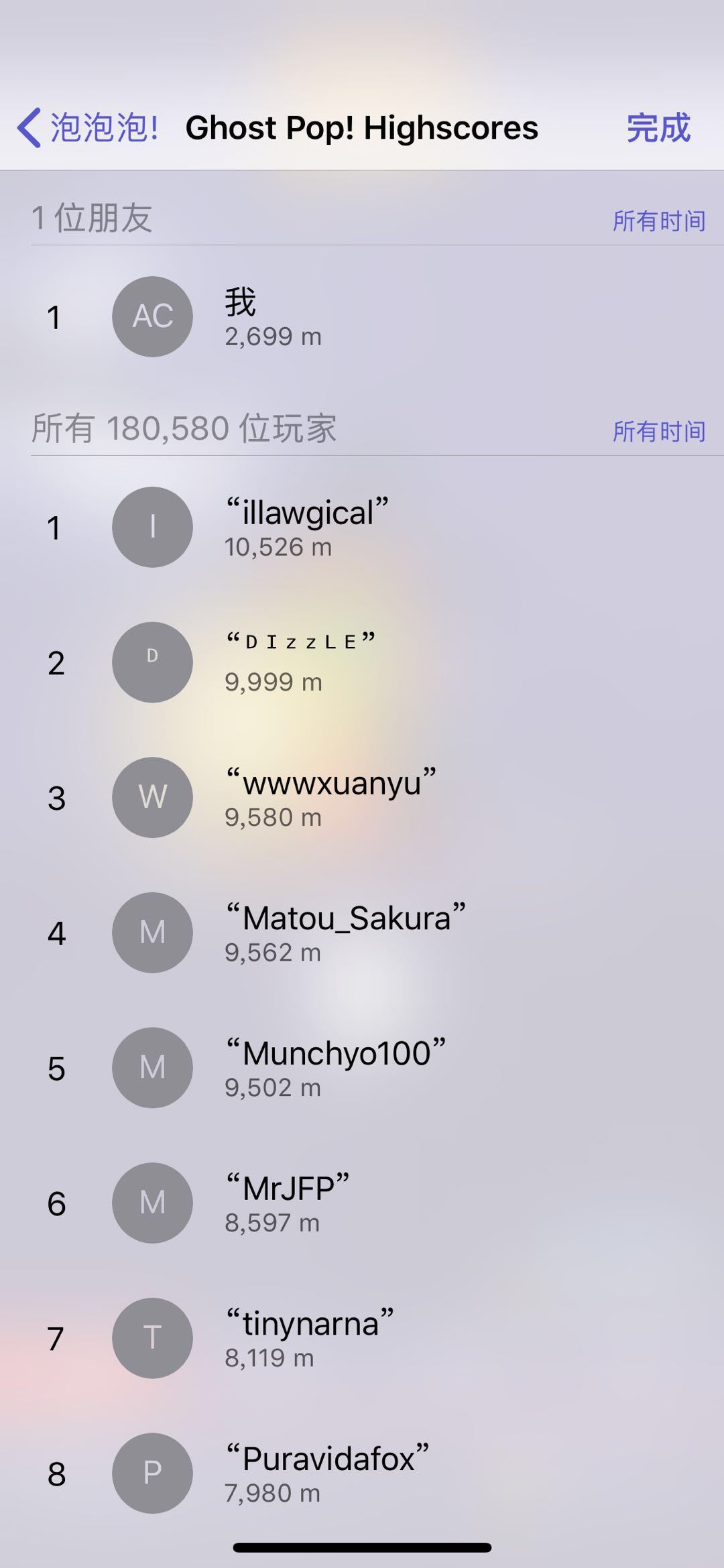 最后,这款游戏接入了iOS自带的GameCenter,而且还设置了游戏排行榜,目前这个游戏第1名最远是10526m,而本人只有2699m,排名1381名(1381/180580)...哪天如果突破5000m再来更新,就酱紫。