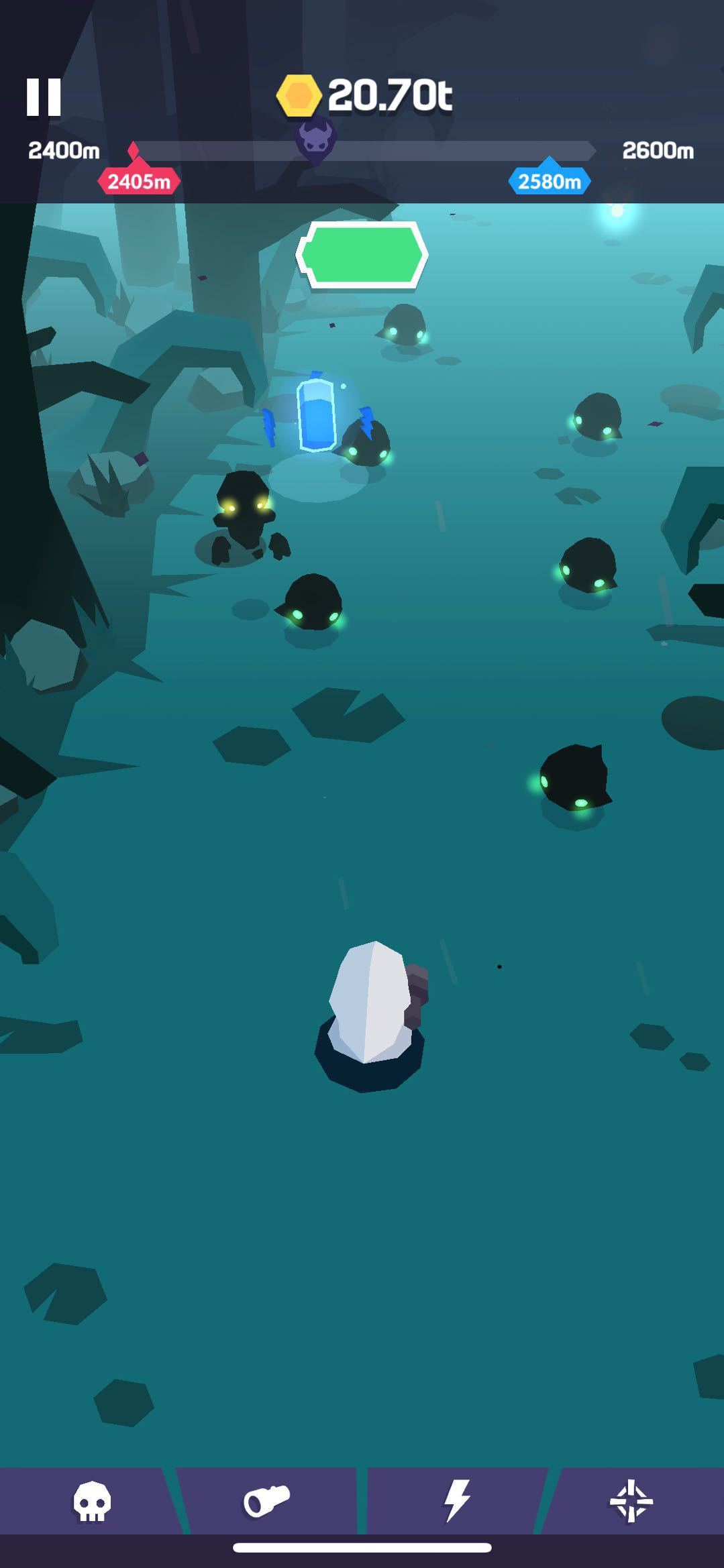 2、关卡内遇到黄色电话和蓝色电池必须捡起,短时间内不限电量,长按持久指哪打哪我最强!