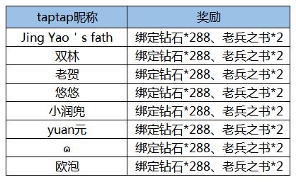 恭喜以下8名探索者大大的评论被抽中,每人将获得绑定钻石*288和老兵之书*2。