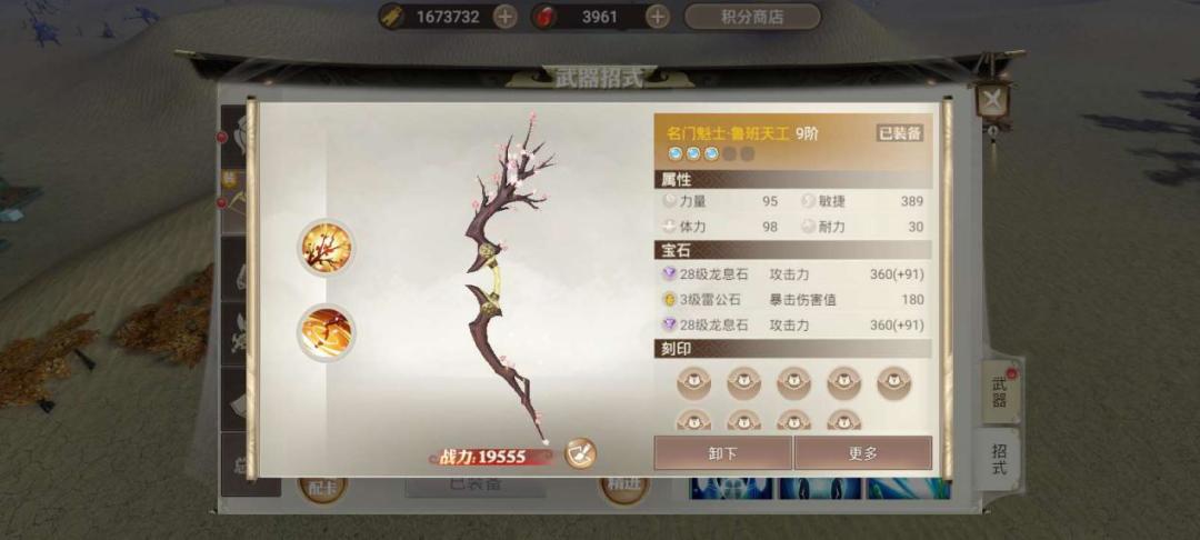 武器精炼时需要注重攻击、暴击伤害两个属性,可镶嵌“龙息石”与“雷公石”提升基础攻击力与暴击伤害。突破8星获得5次伤害触发“天工”状态能大幅提升战斗节奏,先于敌人打出伤害。刻印同样以攻击、暴击伤害为主,“天工”状态下暴击率毫无意义,推荐刻印“高级神威”、“厚积薄发”、“无中生有”。