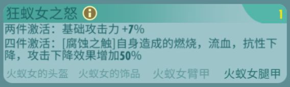 四件套效果(与配件品级无关):【腐蚀之触】自身造成的燃烧,流血,破防,虚弱效果增加50%