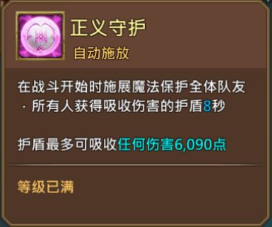 b. 如,玫瑰骑士的技能【正义守护】能在战斗开始时自动释放,持续8秒的保护,每个副本有三个小关卡,共计可释放3次。因此其他治疗技能或控制应避开这个时段,以使英雄技能最优化利用。
