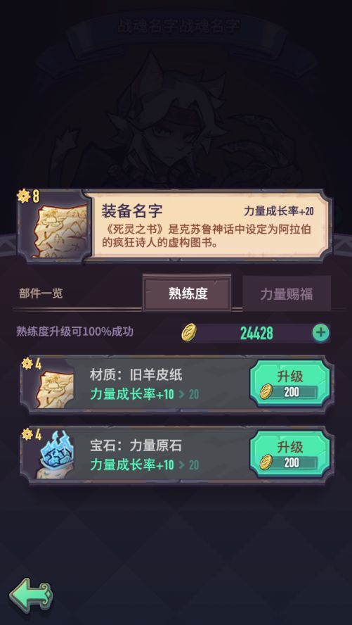 装备是战魂四维属性的主要加成来源,每个战魂会具有4-5件装备,每件装备将会由数个不同的部件组成,例如:材质、宝石、附魔等。我们可以通过不同的部件让装备变得更厉害哦~