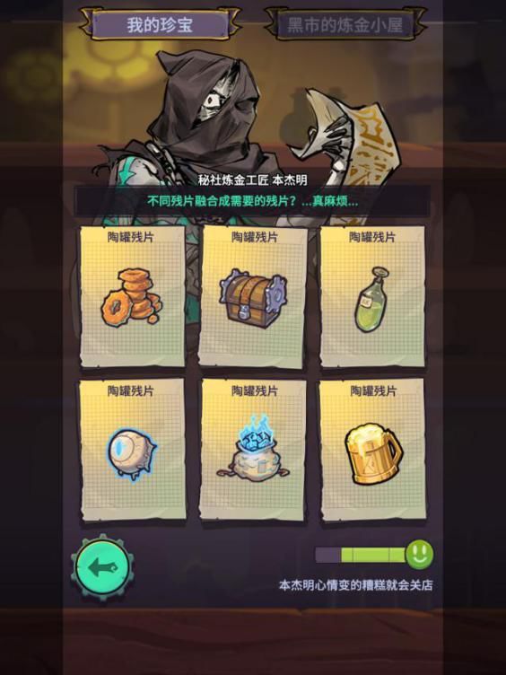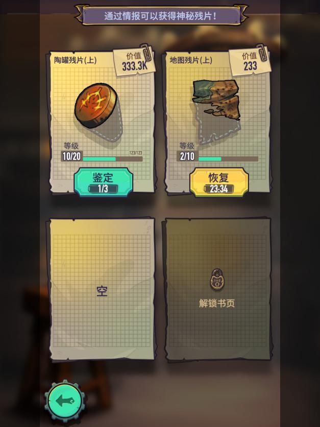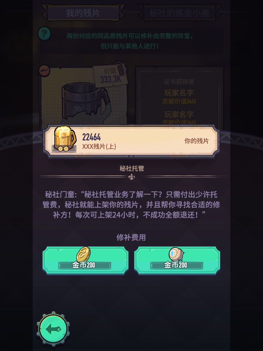 另外,不同的npc会找到不同种类的宝藏残片,这会提高残片配对的难度,不过秘社市场里有重炼功能用已有的残片作为材料炼出自己想要的残片。