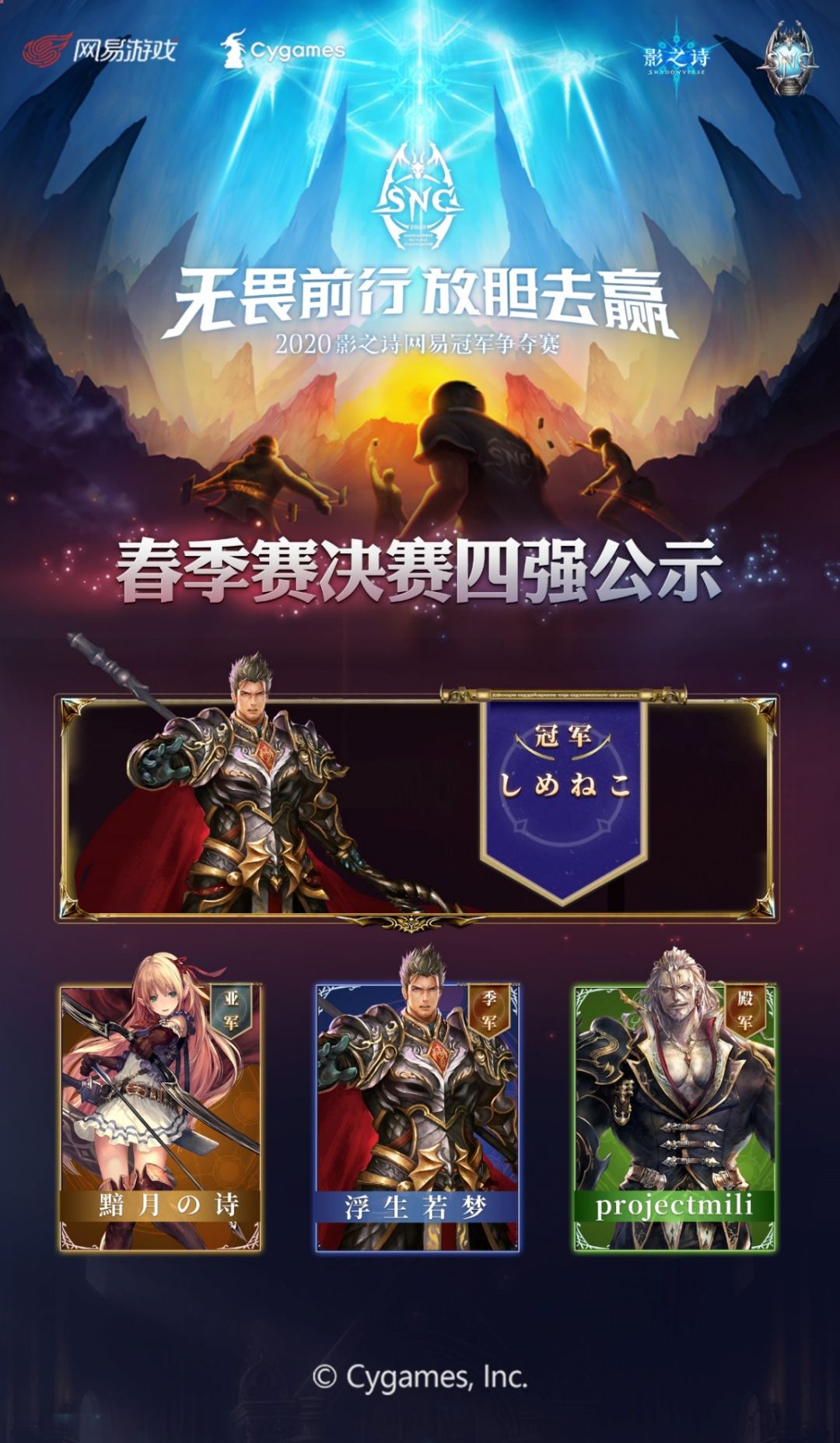 《影之诗》SNC 春季赛经历过了海选赛与决赛共四个比赛日的激烈对抗,在上周落下帷幕。最终选手“しめねこ”经过五场鏖战,斩获春季赛冠军!选手“黯月の诗”、“浮生若梦”、“projectmili”分别获得比赛的亚军、季军、殿军,这四位选手将获得直接晋级海选终轮的资格!