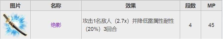 1.对于由一个N段技能,每段攻击都有10%的概率产生一个召唤兽能量石(例如一个技能若有5段,则该技能一次最多能打出5个幻兽能量石。那么如何得知某个技能的段数呢?——你可以在游戏的技能槽里单击技能图标来查询,或者查阅Wiki站里的兵员技能信息or这个技能的介绍,都可以)。例如,下图是wiki上的【雷霆】这一兵员的的技能【绝影】。其段数为4,也就是说该技能最多可产生4个召唤兽能量石。