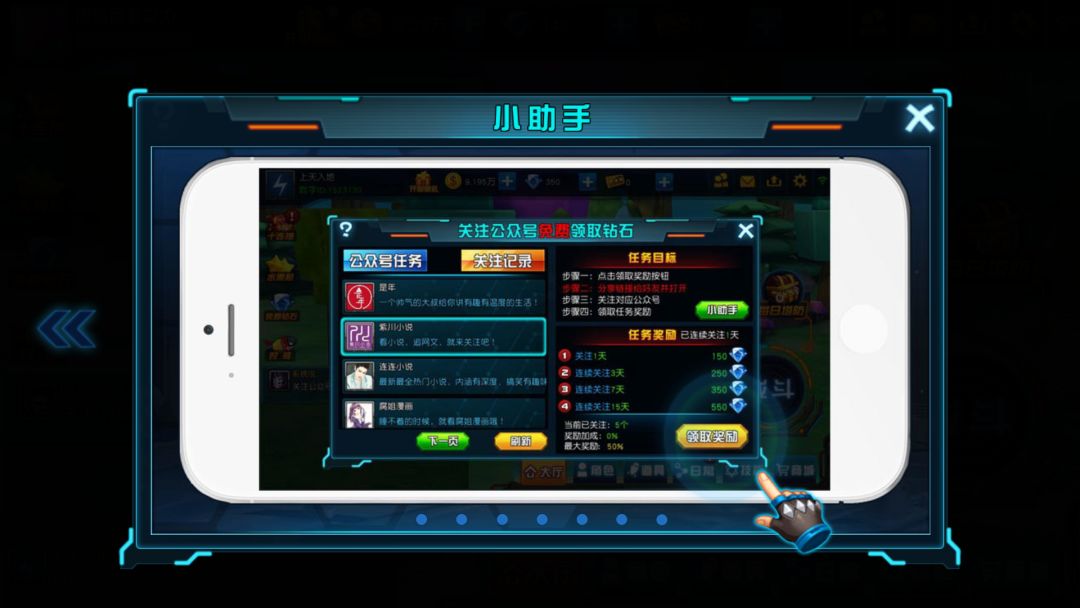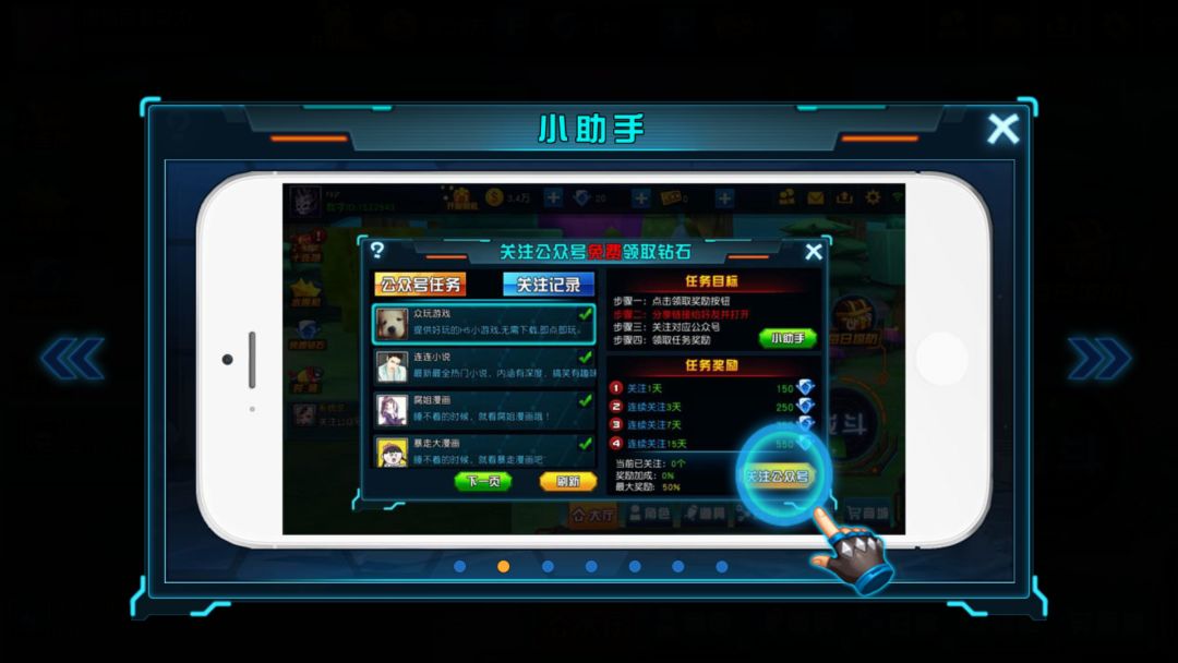 打开“免费钻石”-公众号任务,关注公众号-分享到微信好友-点击分享给微信好友的链接-打开链接并长按链接中的公众号的二维码-识别二维码并关注公众号-回到游戏,在“关注记录”里领取奖励;