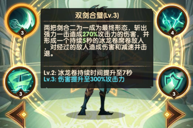 两把剑合并,斩出300%攻击力的伤害,形成一个持续7秒的冰龙卷,对经过的敌人造成伤害,减速并击退。粗看上去这大招好废啊,怎么这么点伤害,实际上埃隆的强大在于开启专武,开启后冰龙卷就会变成对减速的敌人造成高概率的冻结,最高能够达到4秒,被冻结时的敌人再次受到这个大招攻击时,伤害会上升50%。埃隆是少见的强控制型输出,后期的最强输出者之一(前期就算了)玩法很特别。一定要练,不练的话绿裔种族塔就可以放弃了。