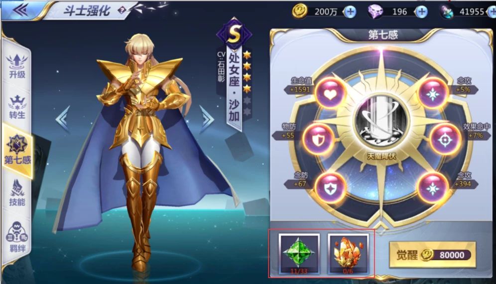 斗士强化界面点击左侧功能菜单第七感即可进行觉醒操作,当所有材料满足后点击右下角的觉醒按钮即可完成觉醒操作。觉醒完成后将会解锁强力的第七感技能。