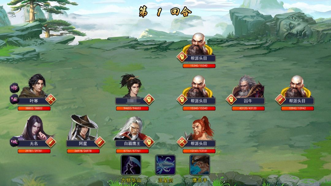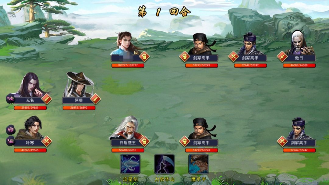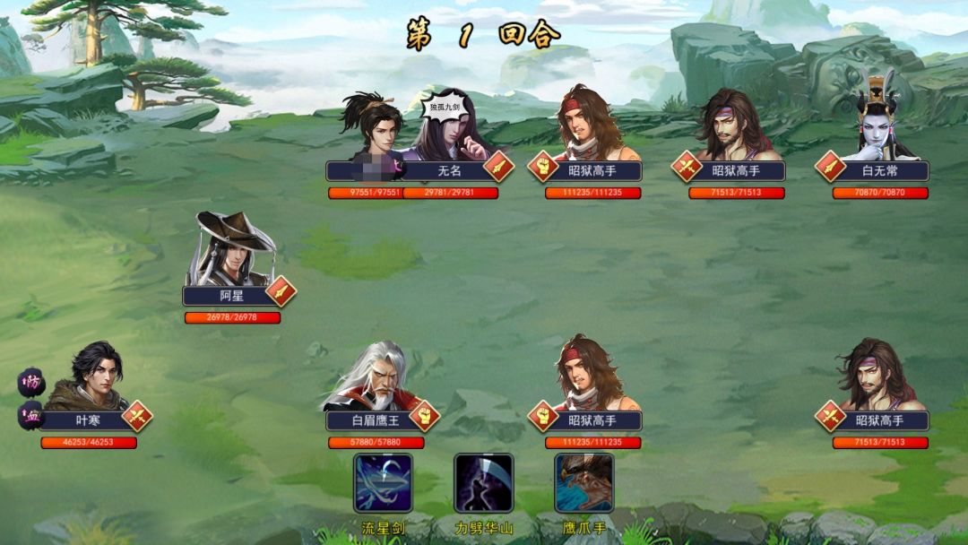 推荐阵型122(上图所述),由于白无常有打三,攻击又高,上排放一个主拳即可,中路放两个打三剑随从优先把白无常击杀,然后对方两个刀用百胜刀法,所以前排拳一定要肉(经脉点复活)