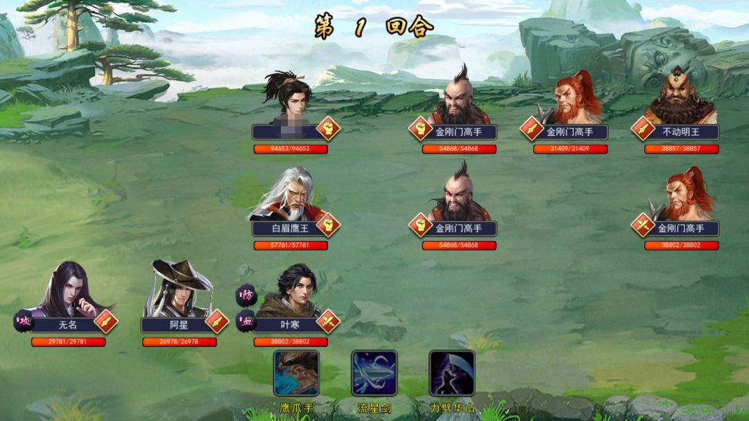 推荐阵型113(上图所述),不动明王使用夺命追魂剑,附带一定吸血,建议主拳顶在前面,经脉点复活,然后拼输出即可,也可以320阵型,拼运气,堵己方剑随从打三,不动明王不触发(如果拼运气建议剑随从经脉点免死)