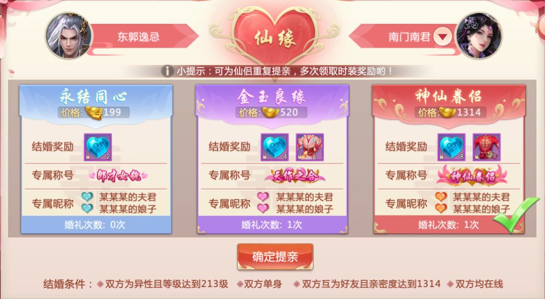 等级达到213级的单身男女,可通过 主界面—仙缘—前往结婚 ,传送到红娘处,选择喜结良缘,向心仪的对象提亲。提亲时男女双方必须在线,同时亲密度也要达到1314。提亲前可以先通过赠送鲜花来提高双方的亲密度哦~