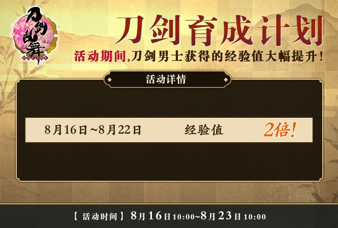 【活动详情】夏日祭活动精彩继续,为应援审神者的活跃参与,特开放“刀剑育成计划”!8月16日至8月22日期间,刀剑男士出阵获得的经验将提升为2倍!请各位审神者切勿错过!