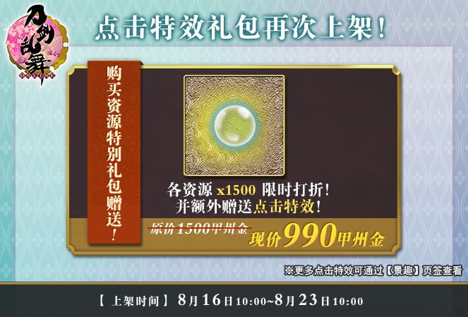 【礼包详情】礼包内含各资源*1500,原价1500甲州金,现价990甲州金。购买即赠国服原创点击特效——气泡。在清爽的夏日里,和刀剑男士们一起吹泡泡吧!