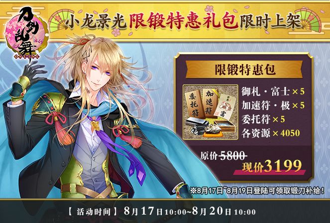 【活动详情】小龙景光限锻特惠礼包内含:御札·富士*5、加速符·极*5、委托符*5、各资源*4050。礼包原价为5800甲州金,每日首次购买特价为3199甲州金。