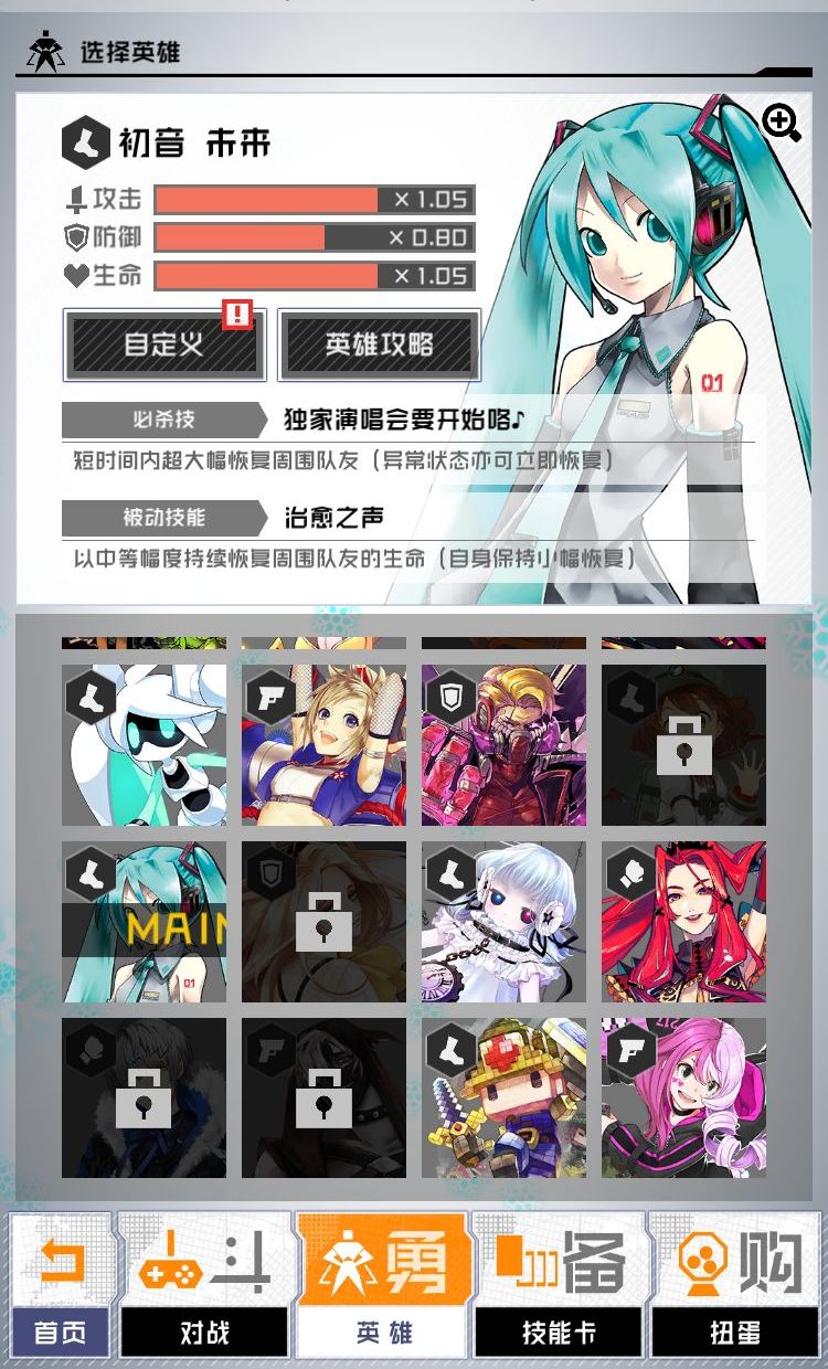 辅助攻击上,推荐使用周围眩晕卡——【号令歌姬】初音未来。这是个能辅助队友攻击的卡牌,可以使周围敌人昏迷5秒,建议初音未来在眩晕的同时,和队友合力将敌人击杀。当然如果没有这张卡,替换UR卡【雷灵的庇护 华金杨】也能起到类似的作用,不过这张卡只能使前方敌人昏迷4秒,而最近有相关限定活动,初音未来限定技能卡相对更容易得,所以,如果能用【号令歌姬】初音未来,还是优先【号令歌姬】初音未来。
