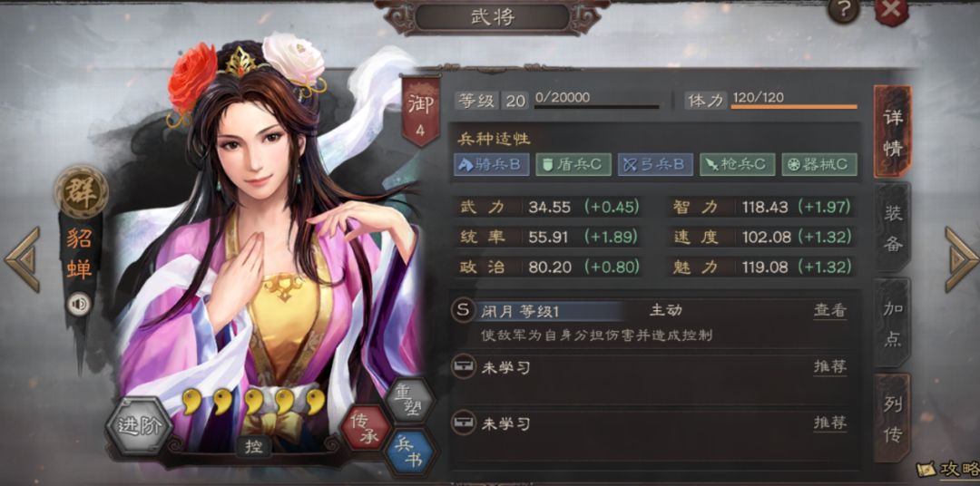 兵种适应性为骑兵,弓兵。属性中庸,但是兵种适用性最高为B。拥有优秀的控制能力,以及辅助能力。