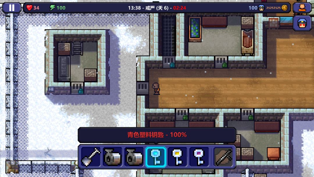 这一关不像上一关无脑打狱警,这一关有点技术含量,好吧,并没有,首先拿到警棍,力量到70,用牙膏和爽身粉合成一坨东西,用打火机和梳子或牙刷合成融化的塑料,打一个狱警,拿到青色钥匙,不要拿走,就地把钥匙和那一坨合成一个模具,把钥匙交给警察叔,呸,塞回狱警的py中,到我这个位置