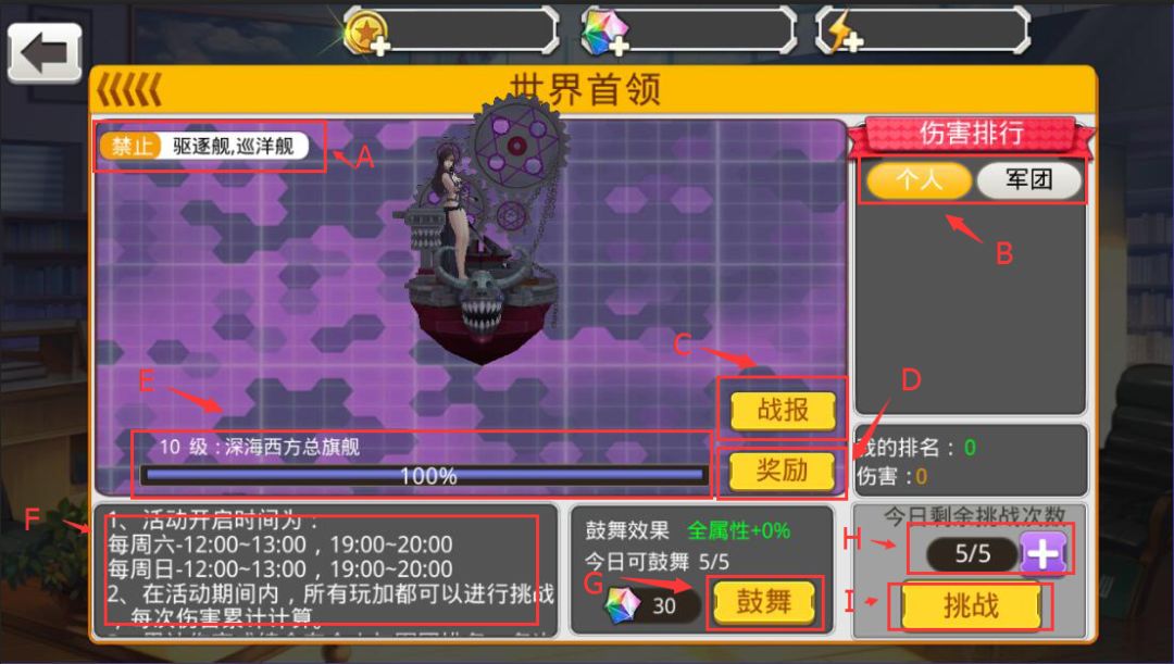 G、点击鼓舞可以提升舰姬在“世界首领”活动中的属性。