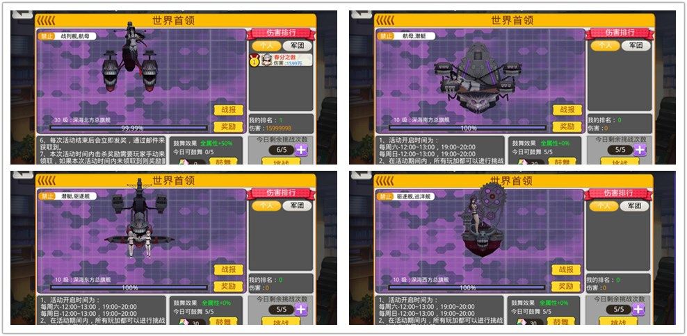 1、活动开启时间为每周六及周日的12:00-13:00、19:00-20:00,共计4轮世界BOSS供玩家进行挑战,每种BOSS都会禁用玩家2个种类的战舰,请各位提督合理安排阵容应对。