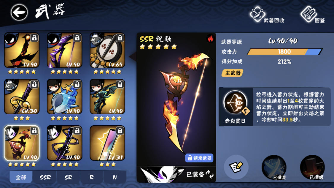 就不用推荐雷弓了,雷系都被我拿去换火水扳手了,对雷弓真的无感。准备养一把3级火扇,现在也2级了,所以主角色也不缺副武器。之前是想好升村正的,可是想了半天,5级真滴有点弟弟,所以很纠结